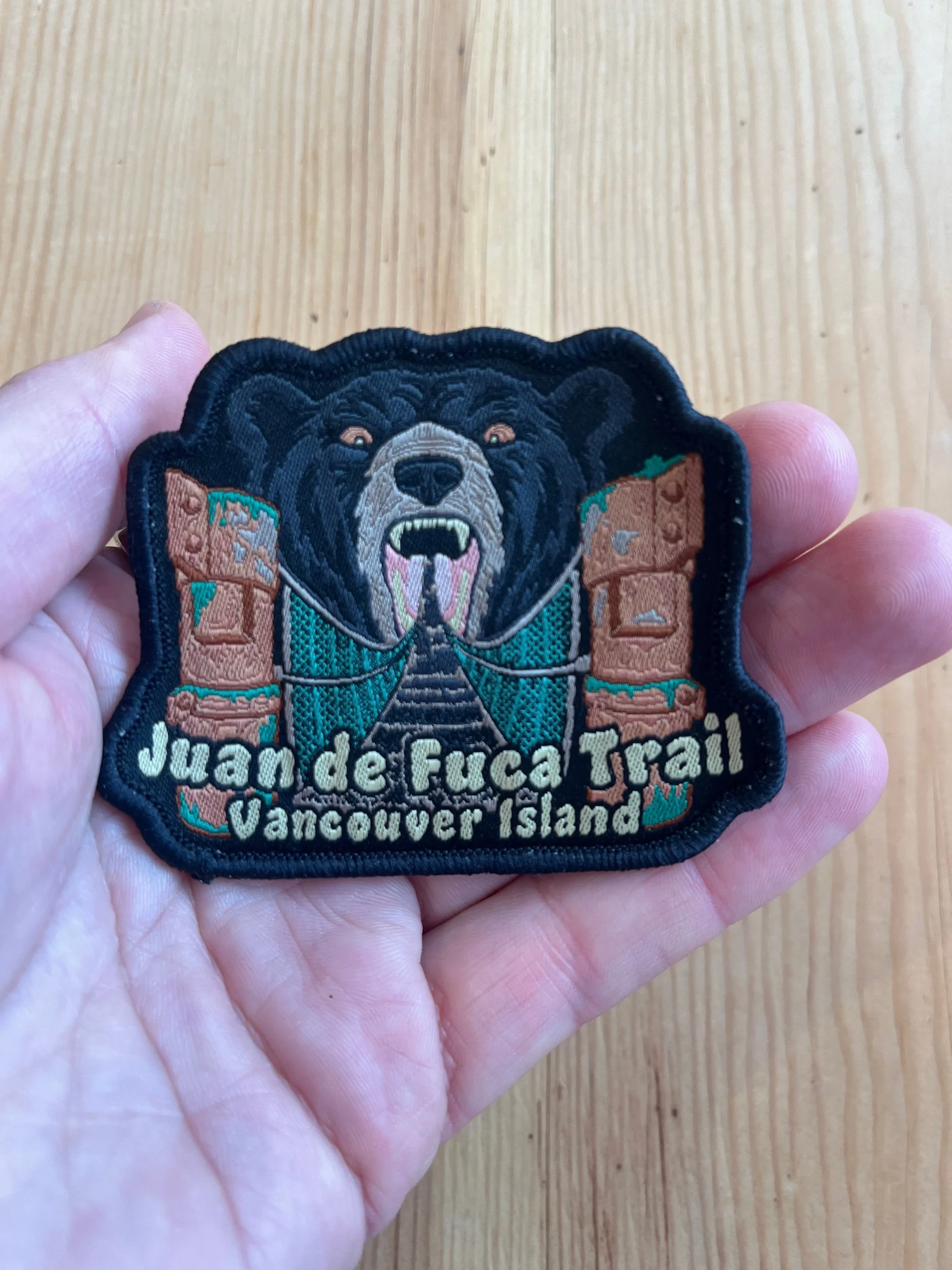 Embrace the rugged spirit of the Juan de Fuca trail with this bold woven patch, designed for the fearless adventurer. Featuring a striking bear representing the untamed power of the Pacific coast, symbolic of the trail’s wild and challenging nature, paired with the suspension bridge, a nod to the trail’s famous heart-pounding ascents and descents. This patch embodies the grit and determination required to conquer the iconic hike. With rich, detailed stitching that brings the scene to life, this patch is a perfect memento for those who’ve braved the Juan de Fuca Trail and a must-have for any adventurer’s collection. Wear it proudly, and show off your journey along one of the most thrilling wilderness trails in the world!- Patch is made for easy iron on